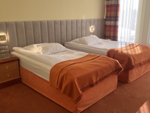 In jedem Zimmer gibt es zwei Einzelbetten sowie einen Arbeits- und Erholungsbereich.